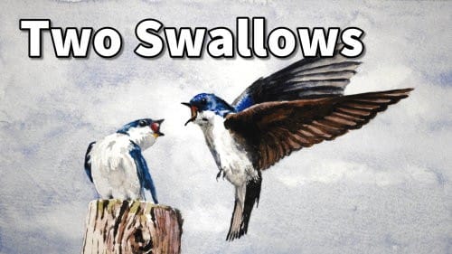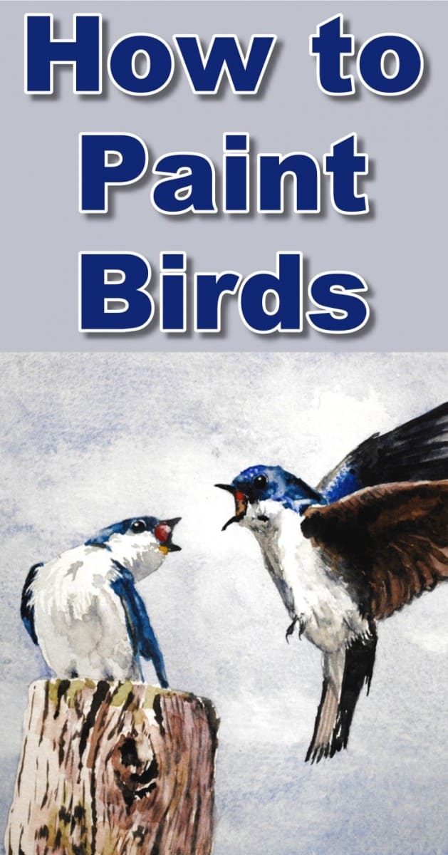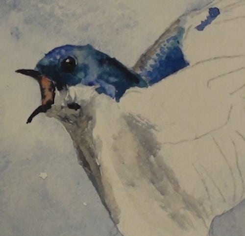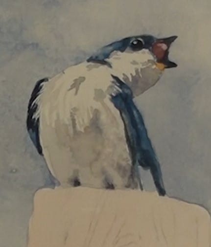 Use the same colour as the first swallow to paint in the dark Blue areas. Burnt Siena is used for the open beak. Continue working on the head and the eye. This bird is the focus point of our painting. The drama in this painting is that he is challenging the other swallow's rights to sitting on the pole.