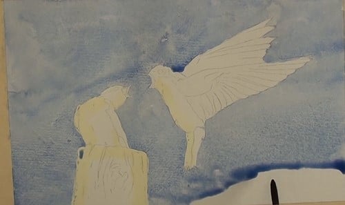 We need to protect all the light colored areas in the painting. Sometimes it is easier to pour out some masking fluid into a small open container rather than using it direct from the bottle. Don't forget to clean the brush in water often to avoid the fluid hardening on the hairs.