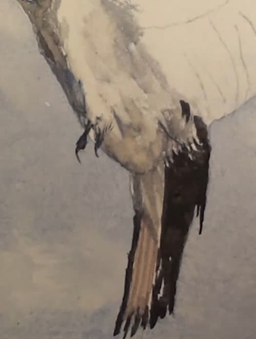 The top of the tail is very dark. Notice again the feathering on the tail, as well as the few areas left unpainted. The underside of the tail is reflecting the same colour as the shadow of the pole. Continue shading in the underside of the body, being a little bit darker lower down.