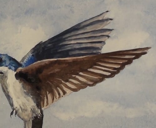 The shadow for the underside of the body is from a very diluted wing color. Work up all the various tonal ranges and small darker shadow patches. Darken up and lighten some areas as you go along.