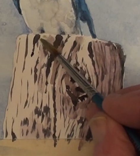 Lay an undercoat of light Alizarin Crimson and let it dry. Paint in all the cracks with the very dark mix we used for the bird. This is a very old and weathered post so it has many marks and cracks in it.
