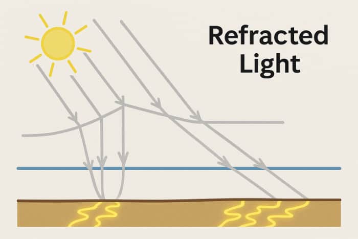 This is where things get a little magical. When light hits the surface of the water, it bends—this is called refraction—and it creates those beautiful, wavy highlights on the bottom. You’ve probably seen it in a swimming pool on a sunny day: those bright little squiggles dancing around on the floor. That’s the refraction at work. It’s not random either—those highlights follow the movement and shape of the surface ripples. So when you’re observing a scene, watch how those light patterns move and change across the bottom.