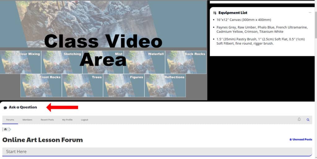 2) If you are on the view class page then just scroll down to below the class video. There you will see the Ask a Question area where you can post your question or photo for feedback. Below is a photo with the Ask a Question area marked (Note that on a phone you will need to scroll a little further down the page to below the Equipment list box to see the Ask a Questions Area)