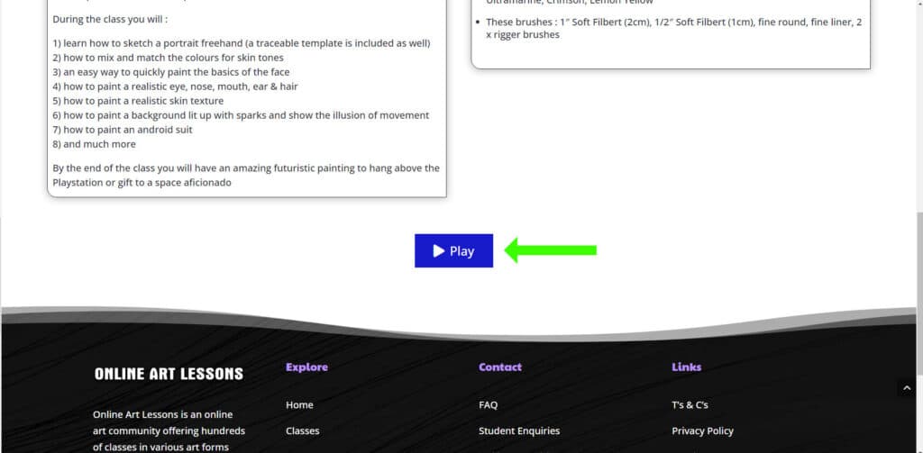 On the Class Overview page (the page with the class description on it) you will find two play buttons. The first is near the top of the page as shown by the green arrow: