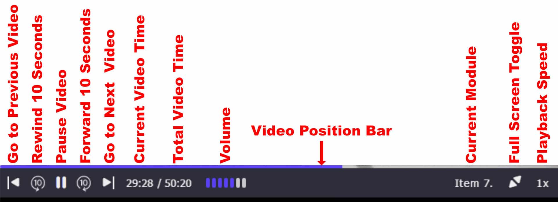 At the bottom of the video player there are several items we can use to control the video. Here are their names: