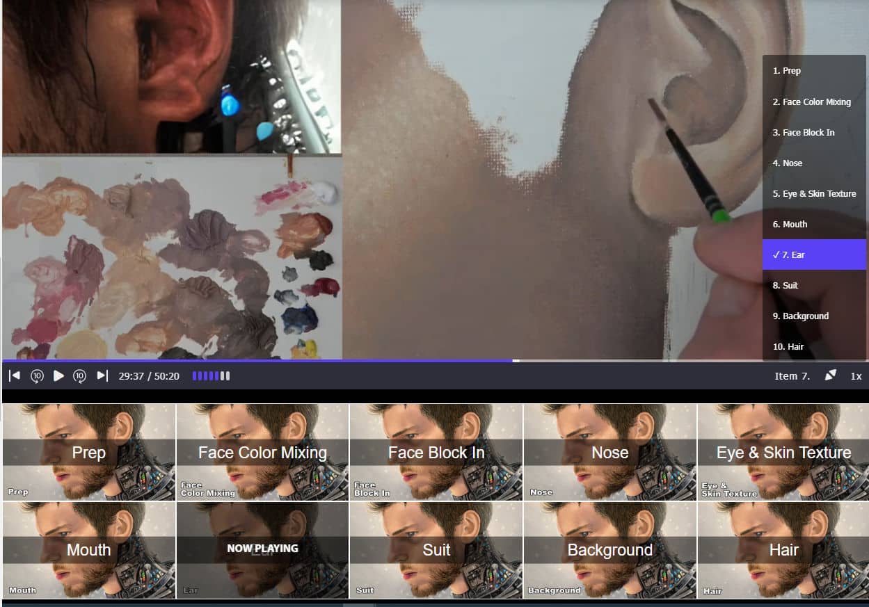 Playback Speed Selector Initially you will see the current playback speed being shown. In our example you are watching at 1x (real time) speed. When you click the speed indicator a bar pops up where you can select the speed you want to watch the video at. Slower speeds are great when painting along and you want to see how a technique is performed at a slower speed. Faster speeds are great for when you want to quickly recap a section of the class previously watched. |