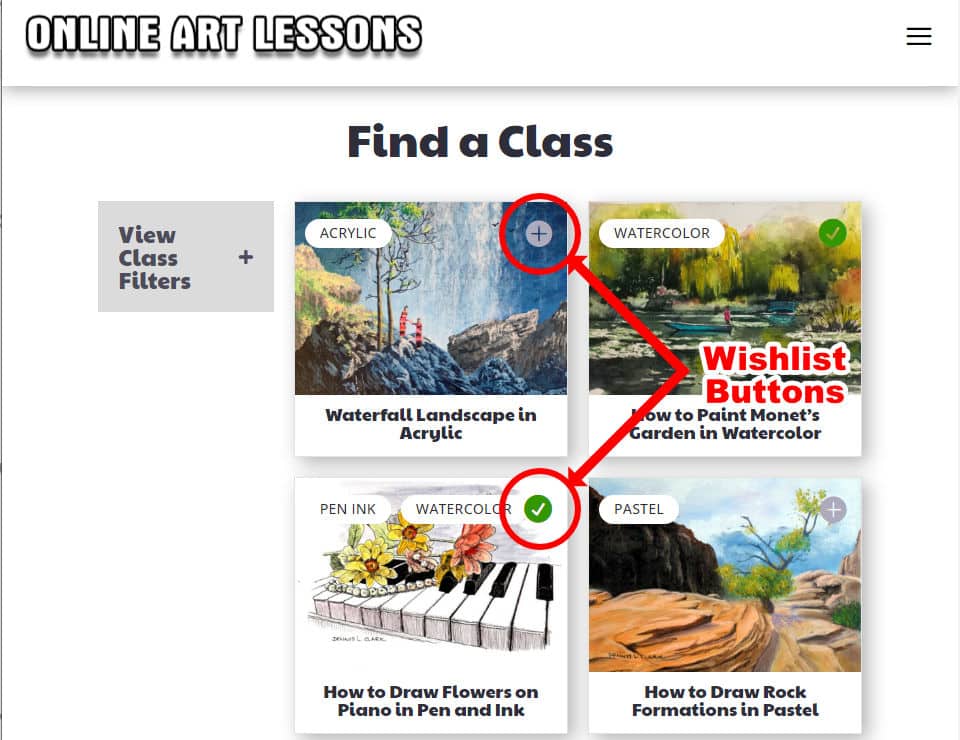 2) As you scroll through the class list you will see classes that interest you. You can the add them to your wishlist. Next time you are looking for a lesson to follow you can start with your favourites inside the wishlist.