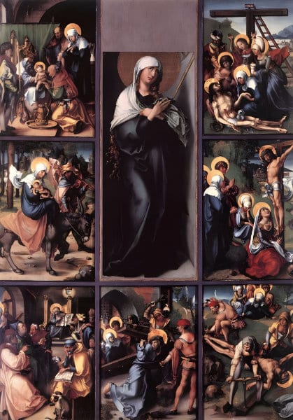 One of his important altarpieces is the “Seven Sorrows Polyptych”. It originally consisted of a central image surrounded by seven panels. It is believed that Durer painted only the central image while his students created the surrounding panels. The right half of the altarpiece, which showed the Seven Joys of the Virgin, has been lost. Only the left half, depicting the Seven Sorrows, survives. This work was produced in Durer’s newly established workshop.