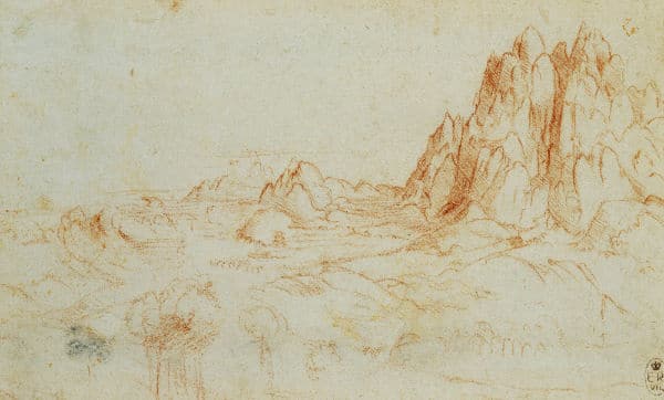 One of the first records of Leonardo's independent work was in 1473, with the drawing of the "Arno Valley." It stands as testament to his continuous fascination with nature and his evolving expertise in depicting landscapes. You can see the drawing below.