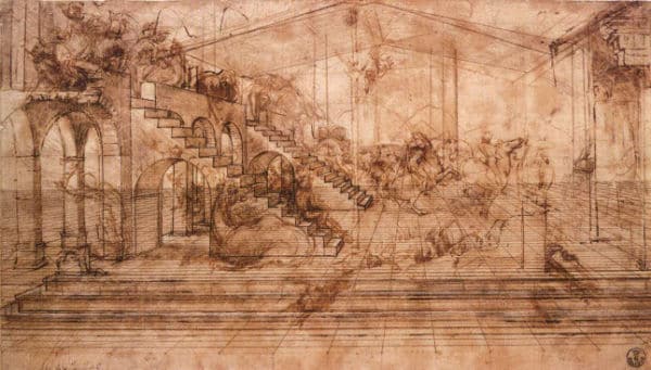He makes use of linear perspective (size diminishing with distance), which was widely used at the time, but also introduced perspective using diminishing detail (objects further away have less detail) and changes in intensity (objects further away are more muted). These were new concepts he had observed and recorded in his notebooks.
