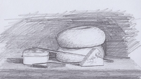Next we can choose the objects we want to use in the still life. I prefer to use objects that compliment or are related to each other, eg., groups of kitchen utensils, or groups of toys, or a variety of gardening tools, even your lunch can make a great still life composition.