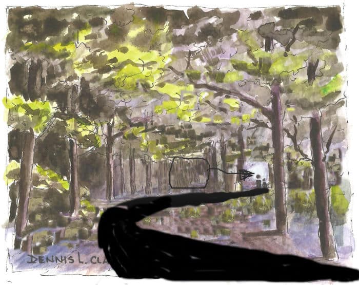 The sketch above looks complicated, but it is not really. The main ink lines are the trunks, a few lines indicate the road then a few rough squiggles for the leaf masses. Only a limited amount of colours are needed to complete this sketch. Even then, you can see how roughly they are washed in.