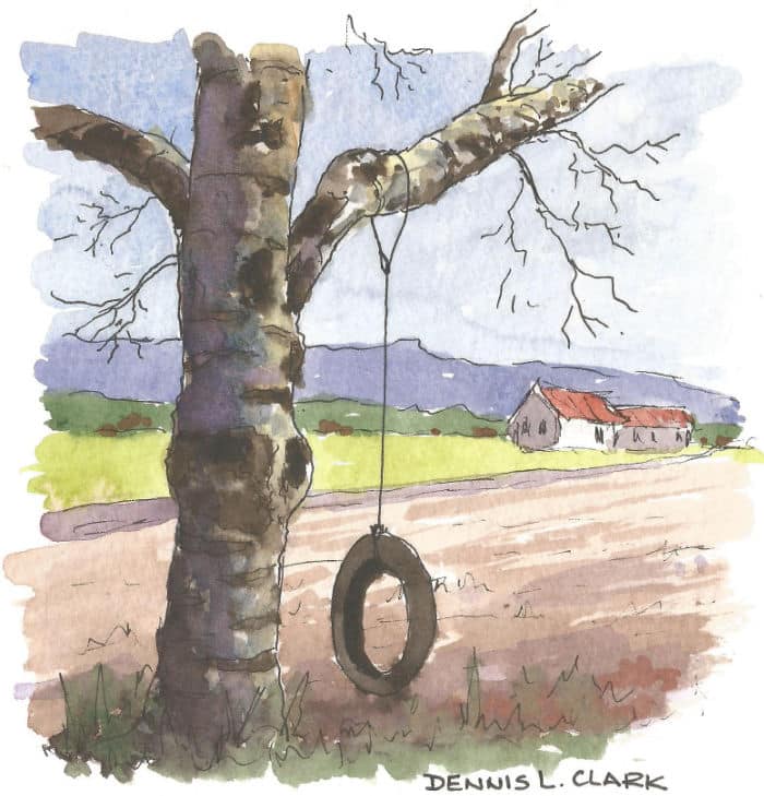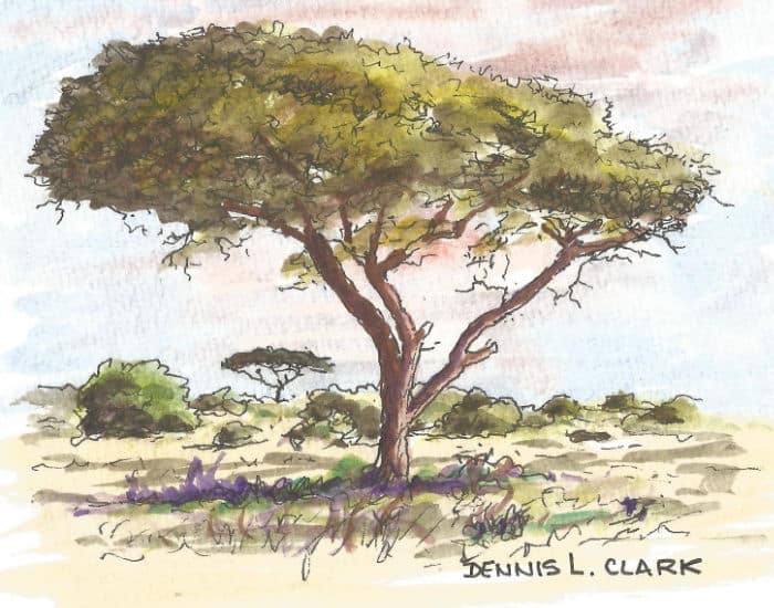 Notice the simplified background in the sketch as well. The tree trunk is the focus point. Add less detail and lighter washes to the distant objects to create the illusion of distance.