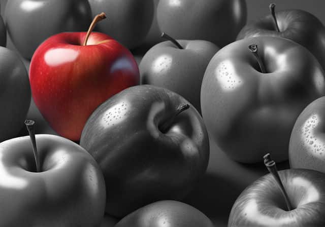 Art, especially paintings or drawings, exists on flat surfaces. Here, balance isn't about actual weight; it's about visual weight. Visual weight is about how much an object in the art grabs our attention compared to others. So, imagine a bright red apple drawn next to a bunch of gray apples. Even if the red apple is smaller, our eyes are drawn to it, giving it more "visual weight."