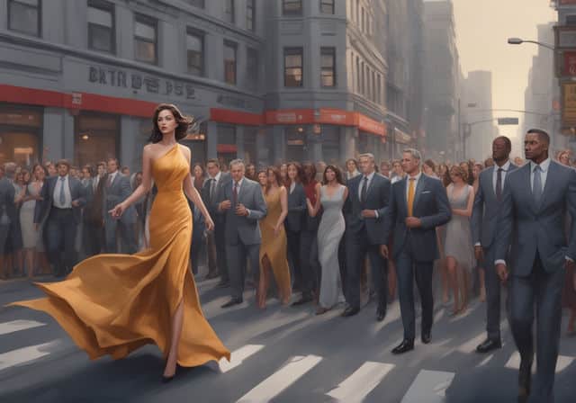 The Solo Dancer: Picture a scene in a busy street with many people walking around. In the center, there's a dancer in a vibrant costume, striking a pose. Even though there are numerous characters in the painting, the dancer, due to her position and vibrant attire, captures your attention immediately.