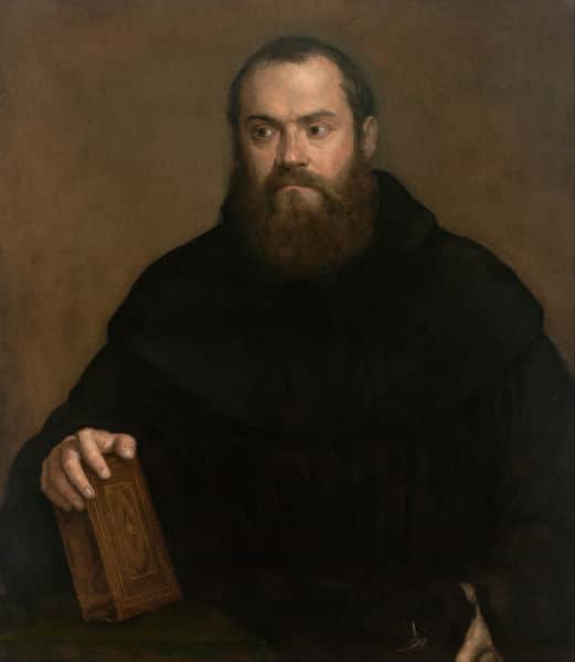 In this painting the monochrome background blends in with the colours of the monk's robe while contrasting with his skin colour so as to draw attention to the focal points of the head and hand.